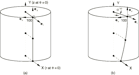 axisymmetric. Figure 3(b) shows the deformed geometry of the reference model shown in Figure 3(a) and the local cylindrical coordinate system at the displaced location of node 100,