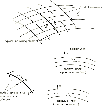 Line spring elements provide inexpensive evaluation of part-through cracks in shells. The basic concept is that these elements introduce the local solution, dominated by the singularity at the crack tip, into a shell model of the uncracked geometry. This is accomplished by allowing an additional freedom in the model along the line of the crack, this freedom being provided by the line spring elements, as indicated in Figure 1.