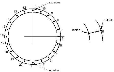 The extrados is the side of the pipebend that is furthest away from the center of the torus defining the pipebend; that is, the side of the pipebend to which the -axis points. The intrados is the side of the pipebend closest to the center of the torus.