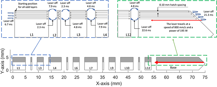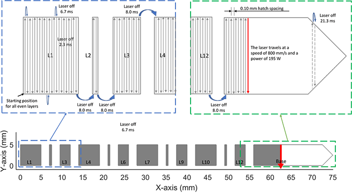 of 80 mm/s. Each powder layer is 0.02 mm thick, and a total of 625 layers is