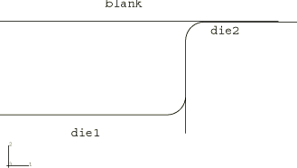 The analysis that is performed entirely within Abaqus/Explicit consists of six steps. In the first step contact is defined between the blank and dies 1 and 2. Both dies remain fixed while a distributed load of 10 MPa in the negative z-direction is ramped onto the blank. This load is then ramped off in the second step, allowing the blank to spring back to an equilibrium state.