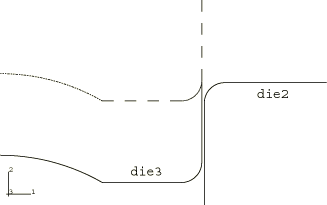 The model consists of a deformable blank and three rigid dies. The blank has a radius of 150.0 mm, is 1.0 mm thick, and is modeled using axisymmetric shell elements, SAX1. The coefficient of friction between the blank and the dies is taken to be 0.1. Dies 1 and 2 are offset from the blank by half of the thickness of the blank, because the contact algorithm takes into account the shell thickness. To avoid pinching of the blank while die 3 is put into position for the second forming stage, the radial gap between dies 2 and 3 is set to be 20% bigger than the initial shell thickness. Figure 1 and Figure 2 show the initial geometry of the model.