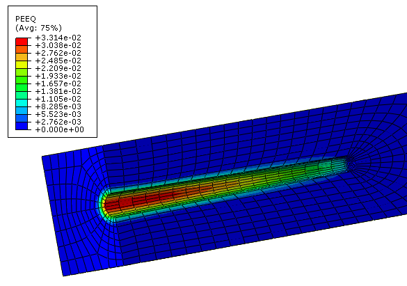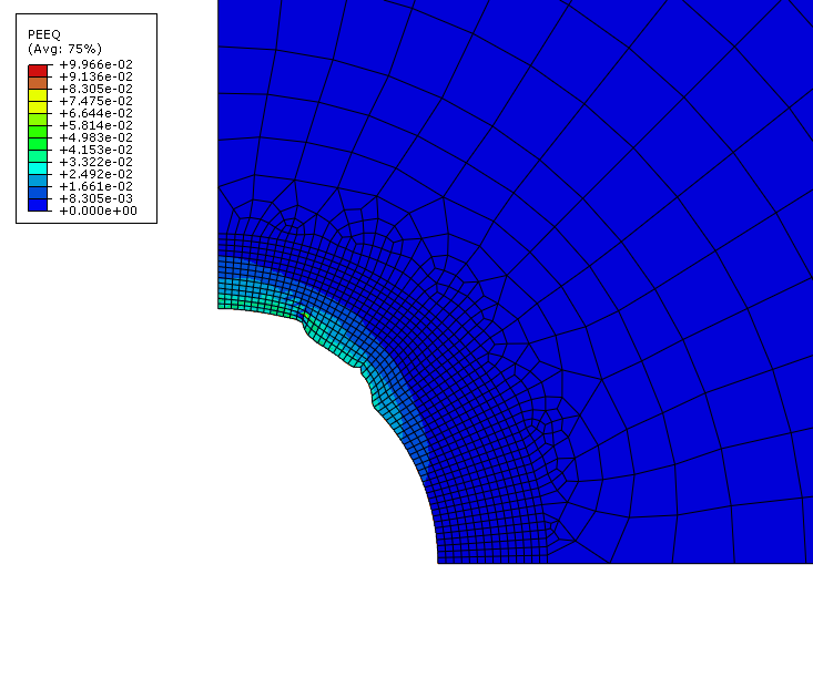 wellbore. Figure 8. Planar model mesh: wellbore region detail: rezone analysis. Figure 9. Equivalent plastic strain distribution and eroded shape of the