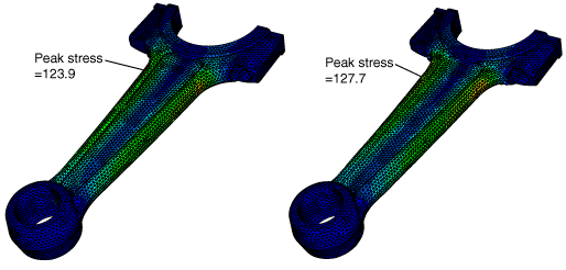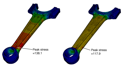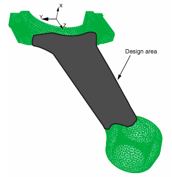This example illustrates shape optimization of a connecting rod. Shape optimization makes slight modifications to the position of the surface nodes in the design area to achieve the optimized solution. Shape optimization is typically applied at the end of the design process when the general outline of a component is fixed and only minor changes are allowed. For more information, see Shape Optimization.
