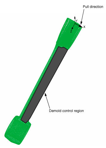 The example introduces a casting restriction by defining demold control geometry restrictions that are applied to the nodes in each half of the design area in the positive x- and negative x-directions. Figure 2 illustrates the demold control geometry restriction that is applied to one half of the design area in the positive x-direction.