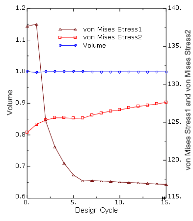 The objective function determines which of the two design responses results in the largest von Mises stress in the design nodes. The objective function then tries to minimize the maximum von Mises stress for that design response.
