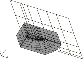 An input file for the case = 0.2, which uses the shell-to-solid submodeling capability, is included. This C3D20R element mesh allows the user to study the local crack area using the energy domain integral formulation for the J-integral. The submodel uses a focused mesh with four rows of elements around the crack tip. A singularity is utilized at the crack tip, the correct singularity for a linear elastic solution. Symmetry boundary conditions are imposed on two edges of the submodel mesh, while results from the global shell analysis are interpolated to two edges by using the submodeling technique. The global shell mesh gives satisfactory J-integral results; hence, we assume that the displacements at the submodel boundary are sufficiently accurate to drive the deformation in the submodel. No attempt has been made to study the effect of making the submodel region larger or smaller. The submodel is shown superimposed on the global shell model in Figure 5.