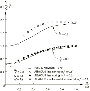 The line spring elements in Abaqus allow inexpensive evaluation of the effects of surface flaws in shell structures, with sufficient accuracy for use in design studies. The basic concept of these elements is that they introduce the local solution, dominated by the singularity at the crack tip, into a shell model of the uncracked geometry. The relative displacements and rotations across the cracked section, calculated in the line spring elements, are then used to determine the magnitude of the local strain field and hence the J-integral and stress intensity factor values, as functions of position along the crack front. This example illustrates the use of these elements and provides some verification of the results they provide by comparison with a published solution and also by making use of the shell-to-solid submodeling technique.