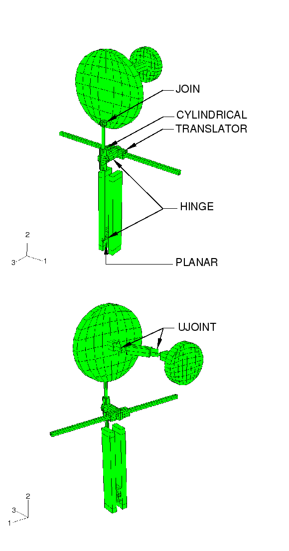 The crank mechanism considered here transmits a rotational motion through two universal joints and then converts the rotation into translational motion of two slides. The mechanism is modeled using nine rigid components attached with eight connector elements. The various kinematic constraints modeled with connector elements include TRANSLATOR, which allows relative translation along a line but no rotations; HINGE, which allows one relative rotation and fixes relative translations; CYLINDRICAL, which allows relative translation along a line and relative rotation about that line; JOIN, which fixes relative translations but leaves the rotations free; PLANAR, which keeps a point on a plane and allows only relative rotations about the normal to that plane; and UJOINT, which fixes the relative translations and enforces a universal constraint on the relative rotations. The complete model is shown in Figure 1.