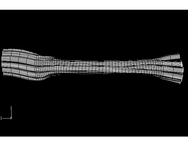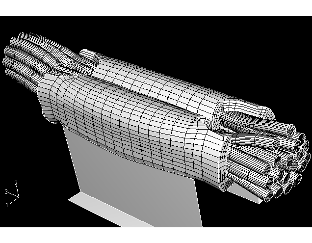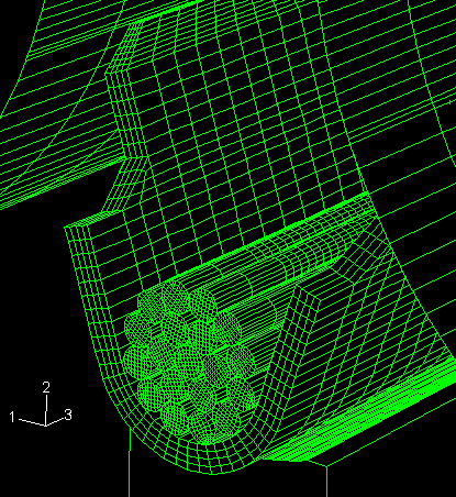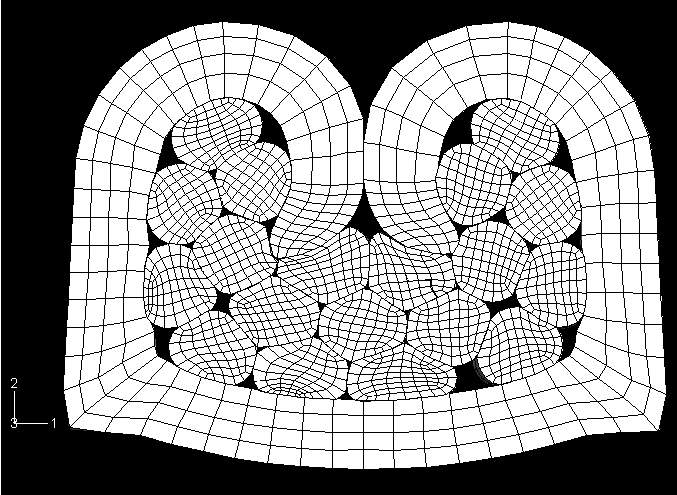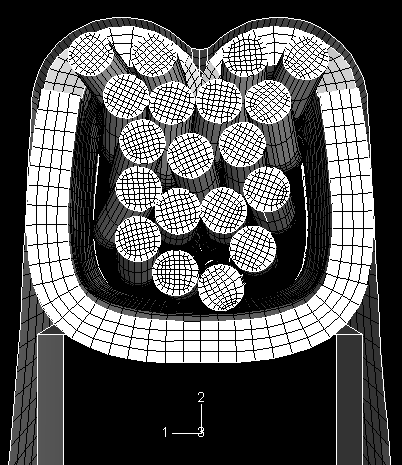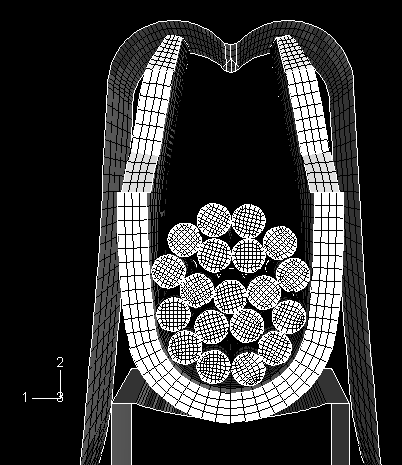 In this example the grip is 0.25 mm thick and has a 50% coin at the tips. Coining is done to help the grip arms curl over the wire bundle as they are pushed against the roof of the punch during crimping. The grip arm tips are 3.28 mm apart initially (wing tip width). A nineteen-strand wire bundle is used, with each strand having a 0.28 mm diameter. Figure 1 shows the model geometry prior to crimp forming. Figure 2 shows a close-up view of the wire-grip assembly.