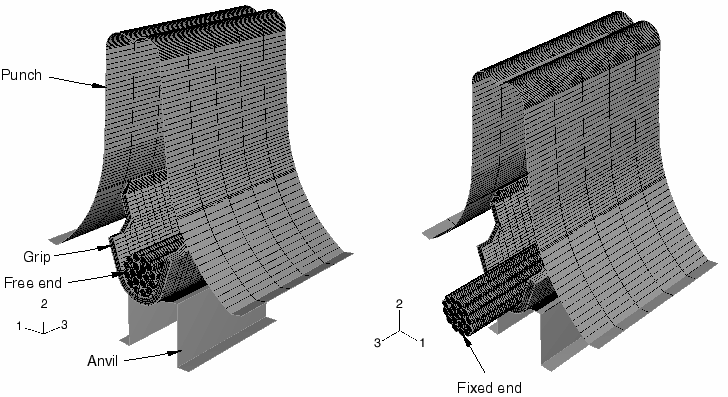 This model simulates crimp forming. Modern automobiles contain several thousand crimp joints. In a crimp joint a multi-strand wire bundle is mechanically joined to an end terminal to provide electrical continuity across the joint. The portion of the terminal that is folded over and into the wire bundle during crimping is called the grip. Proper design of a crimp joint depends on a number of competing factors including the diameter and number of the wire strands; the thickness, length, and material of the grip; and the geometry and surface finish of the crimp tooling. Out-of-plane extrusion of the wire bundle and grip during crimping is a significant factor in crimp formation.