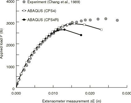 The failure strength in laminates also depends on the ply layup. The effective failure strength of the layup is at a maximum if neighboring plies are orthogonal to each other. The effective strength decreases as the angle between plies decreases and is at a minimum if plies have the same direction. (This is called a ply cluster.) Chang and Lessard have obtained some empirical formulas for the effective transverse tensile strength; however, in this model we ignore such effects. Instead, we use the following strength properties for the T300/976 laminate: transverse tensile strength =102.4 MPa (14.86 ksi), ply shear strength =106.9 MPa (15.5 ksi), matrix compressive strength =253.0 MPa (36.7 ksi), and fiber buckling strength =2707.6 MPa (392.7 ksi).