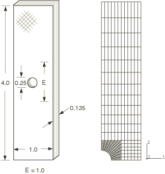 A composite plate with a hole in the center is subjected to in-plane compression. The plate is made of 24 plies of T300/976 graphite-epoxy in a [(−45/+45)] layup. Each ply has a thickness of 0.1429 mm (0.005625 in); thus, the total plate thickness is 3.429 mm (0.135 in). The plate has a length of 101.6 mm (4.0 in) and a width of 25.4 mm (1.0 in), and the diameter of the hole is 6.35 mm (0.25 in). The plate is loaded in compression in the length direction. The thickness of the plate is sufficient that out-of-plane displacements of the plate can be ignored. The compressive load is measured, as well as the length change between two points, originally a distance of 25.4 mm (1.0 in) apart, above and below the hole. The plate geometry is shown in Figure 1.