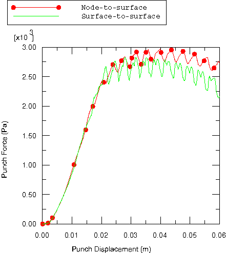 the node-to-surface and surface-to-surface contact pair formulations is shown in Figure 6. The differences in the reaction force history are due to consideration of the blank