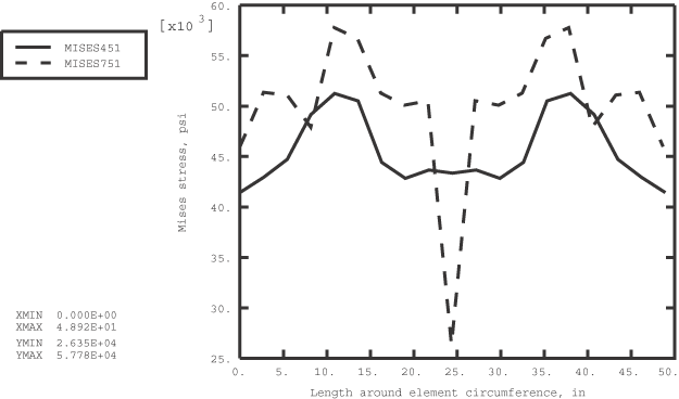 outer surfaces of the elements (section points 1 and 7, respectively). Figure 8 shows the variation of the von Mises stress around the circumference of two elements (451