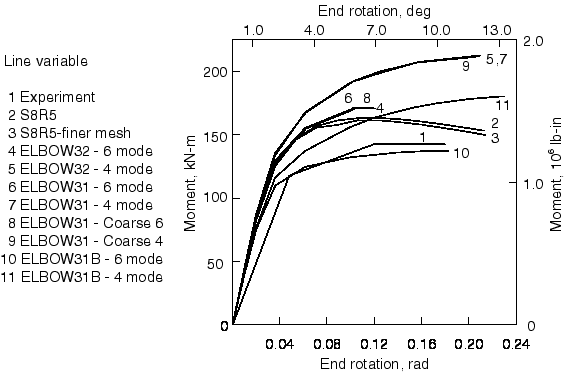 material response. Figure 2. Models for elbow/pipe interaction study. Figure 3. Moment-rotation response: mesh convergence studies. Figure 4. Moment-rotation response: pressure dependence. Figure 5. Strain distribution on the outside surface: closing moment
