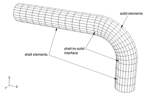 curved surfaces. A solid submodel using C3D27R elements is created around the elbow part of the pipe, spanning