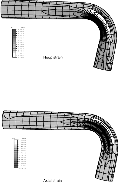 The strain contours are slightly discontinuous at the ends of the curved elbow