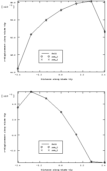 Figure 1. Mesh used for the complete fan model. Figure 2. Substructures generated. Figure 3. Datum sector for cyclic symmetry model. Figure 4. Displacements due to pressure loading along path