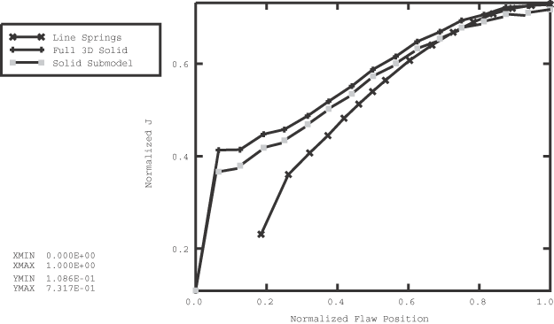 Results from the submodeled analyses are compared to the LS3S line spring element analysis and full solid element mesh for