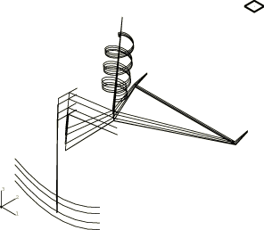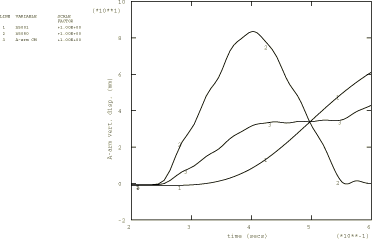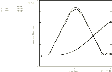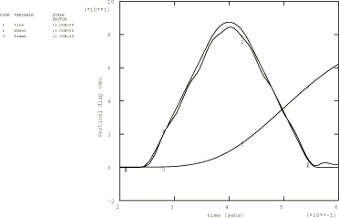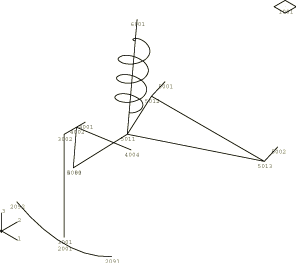 The structure analyzed is an automobile's left front suspension subassembly (see Figure 1). The physical components included in the assemblage are the tire, the wheel, the axle (hub), the A-arm (wishbone), the coil spring, and the frame. The tire is modeled with a JOINTC or connector element; a curved bar element has been attached for visualization. (The JOINTC or connector element is used because it is a convenient way of defining the tire's nonlinear stiffness in a local coordinate system.) The vertical stiffness of the wheel is represented by a beam element. The axle and A-arm are both modeled with beam elements. The axle is connected to the A-arm by a pin-type MPC in the JOINTC model or with connection type JOIN in the connector model. The coil spring is modeled by a SPRINGA element in the JOINTC model or with connection type AXIAL in the connector model. The automobile frame is represented by a MASS element. The top of the coil spring is connected directly to the frame, while the A-arm is connected to the frame by two JOINTC elements or two connector elements with connection types CARTESIAN and ROTATION (representing the A-arm bushings). The initial position represents a fully weighted vehicle, and the tire and coil spring have a corresponding initial preload.