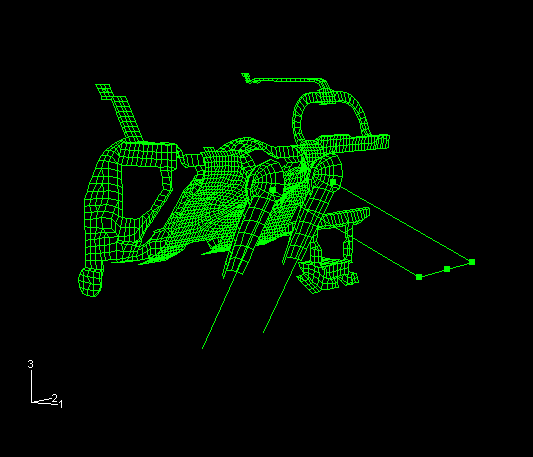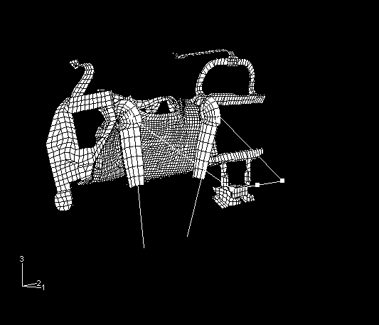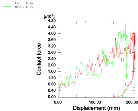 Initial velocities are defined on the leg components to approximate a 15 mph (6 m/s) crash condition. The hips are constrained to translate in the plane of the seat. The ankles are constrained consistent with fixed planting of the feet on the floor of the car. The dashboard substructure is fixed at locations where it would be welded to the automobile frame; deformations due to this impact are assumed to be confined to the explicitly modeled structure.