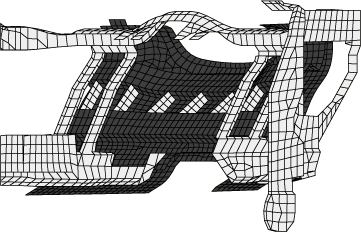 The components of the instrument panel are modeled using S3R and S4R shell elements. The bolster is made up of 2690 shell elements, with the material modeled as a von Mises, elastic strain hardening plastic material with a Young's modulus of 2.346 GPa, a Poisson's ratio of 0.4, a density of 1140 kg/m3, and a yield stress of 11.7 MPa. The steel substructure is made up of 1648 elements, with the material modeled as a strain hardening steel with a Young's modulus of 207 GPa, a Poisson's ratio of 0.3, a density of 7700 kg/m3, and a yield stress of 207 MPa. Figure 1 shows the model geometry from the rear of the knee bolster prior to impact, and Figure 2 shows the knee bolster and knee/leg assembly from a position outboard and behind the driver prior to impact.