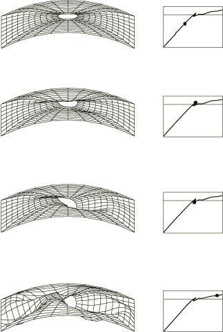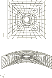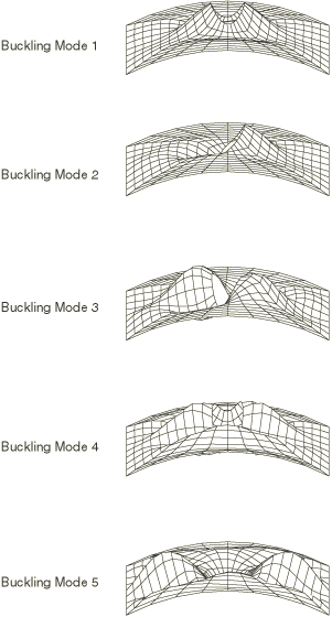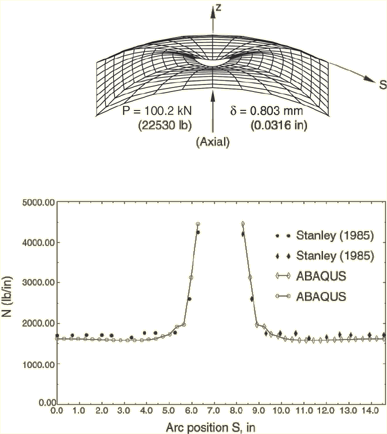 The shell elements used in this example use an approximation to thin shell theory, based on a numerical penalty applied to the transverse shear strain along the element edges. These elements are not universally applicable to the analysis of composites since transverse shear effects can be significant in such cases and these elements are not designed to model them accurately. Here, however, the geometry of the panel is that of a thin shell; and the symmetrical lay-up, along with the relatively large number of laminae, tends to diminish the importance of transverse shear deformation on the response.