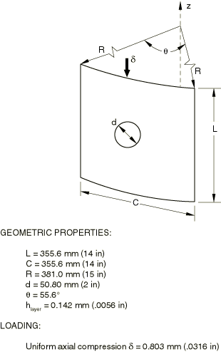 The structure analyzed is shown in Figure 1 and was originally studied experimentally by Knight and Starnes (1984). The test specimen is a cylindrical panel with a 355.6 mm (14 in) square platform and a 381 mm (15 in) radius of curvature, so that the panel covers a 55.6° arc of the cylinder. The panel contains a centrally located hole of 50.8 mm (2 in) diameter. The shell consists of 16 layers of unidirectional graphite fibers in an epoxy resin. Each layer is 0.142 mm (.0056 in) thick. The layers are arranged in the symmetric stacking sequence {45/90/0/0/90/45} degrees repeated twice. The nominal orthotropic elastic material properties as defined by Stanley (1985) are