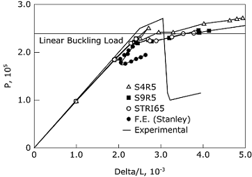 The panel is fully clamped on the bottom edge, clamped except for axial motion on the top edge and simply supported along its vertical edges. Three analyses are considered. The first is a linear (prebuckling) analysis in which the panel is subjected to a uniform end shortening of 0.8 mm (.0316 in). The total axial force and the distribution of axial force along the midsection are used to compare the results with those obtained by Stanley (1985). The second analysis consists of an eigenvalue extraction of the first five buckling modes. The buckling loads and mode shapes are also compared with those presented by Stanley (1985). Finally, a nonlinear load-deflection analysis is done to predict the postbuckling behavior, using the modified Riks algorithm. For this analysis an initial imperfection is introduced. The imperfection is based on the fourth buckling mode extracted during the second analysis. These results are compared with those of Stanley (1985) and with the experimental measurements of Knight and Starnes (1984).