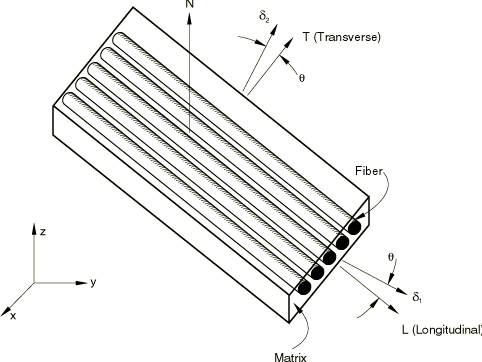 where the 1-direction is along the fibers, the 2-direction is transverse to the fibers in the surface of the lamina, and the 3-direction is normal to the lamina.
