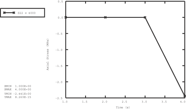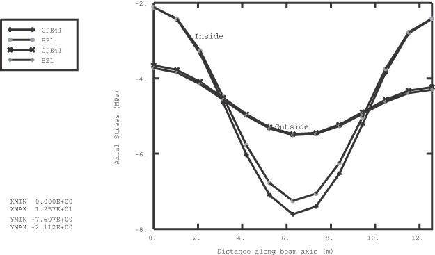 In the first input file the 150-mm-thick liner is discretized with one layer of incompatible mode elements (element type CPE4I). These elements are recommended in regions where bending response must be modeled accurately. In the second input file beam elements are used to discretize the liner. The liner is attached rigidly to the tunnel. The concrete is assumed to have cured to a strength represented by the elastic properties shown in Figure 1 by the time the liner is loaded. The liner is not shown in this diagram.