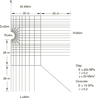 An initial stress field due to gravitational and tectonic forces exists through the depth of the soil. It is assumed that this stress varies linearly with depth and that the ratio between the horizontal and vertical stress components is 0.5. The self weight of the clay is 20.0 kN/m3.