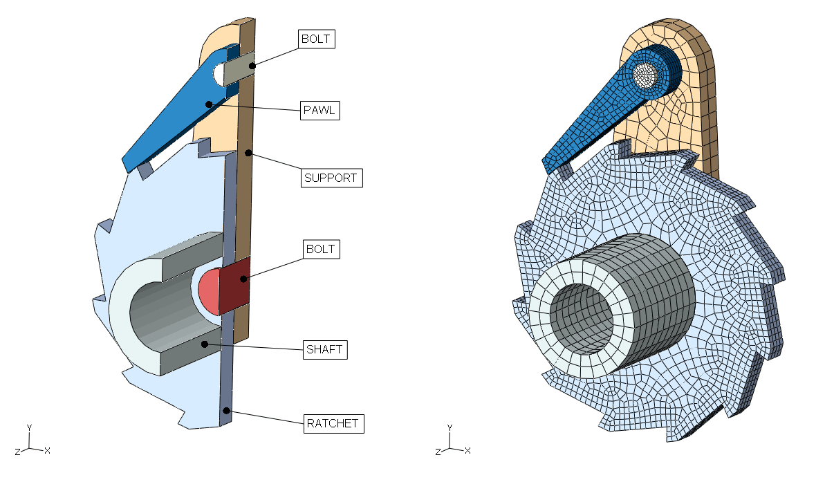 The model is shown in Figure 2, which somewhat resembles the ratchet mechanism within the tool shown in Figure 1; however, this model is not representative of design details of any specific product. The ratchet mechanism is intended to restrict clockwise motion of the ratchet wheel. The pawl and ratchet wheel are each attached to a stiff support using cylindrical bolts. The ratchet-bolt and pawl-bolt interfaces do not restrict axial rotation of the ratchet and pawl. A torsional spring, which is not shown in the figure, tends to keep the pawl in contact with the ratchet wheel. The ratchet wheel is attached to a hollow shaft. A cable and a lever would also be attached to the shaft in a ratchet lever hoist; however, these aspects are not modeled explicitly.