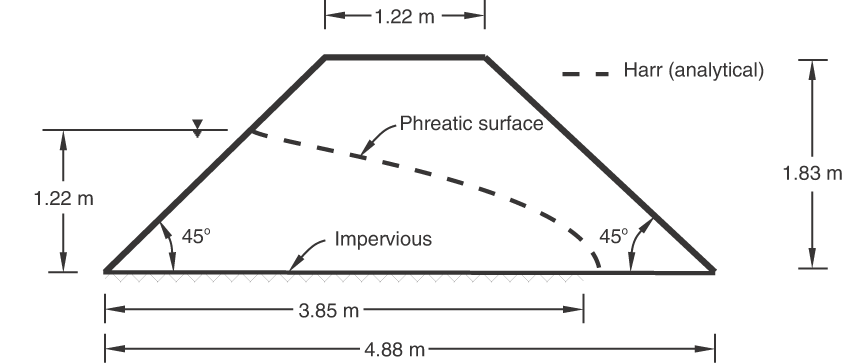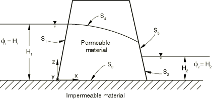 A special boundary condition is needed if the phreatic surface reaches an open, freely draining surface, as indicated on surface in Figure 1. In such a case the pore fluid can drain freely down the face of the dam, so = 0 at all points on this surface below its intersection with the phreatic surface. Above this point 0, with its particular value depending on the solution. This example is specifically chosen to include this effect to illustrate the use of the Abaqus drainage-only flow boundary condition.
