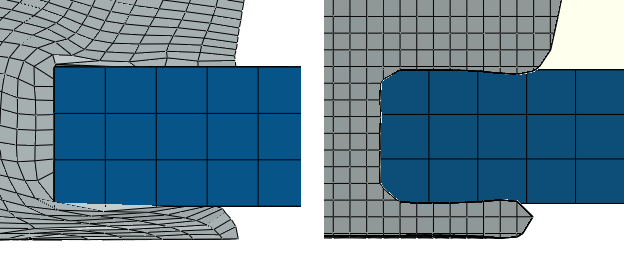 millimeters. Figure 4. Rivet mesh in the pure Lagrangian case. Figure 5. Cross-section of the Eulerian mesh with the rivet material assigned. Figure 6. The Lagrangian parts are assembled inside of the Eulerian mesh. Figure 7. Deformed configuration for the pure Lagrangian case (left) and the