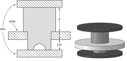 Figure 1. Using a rivet to fasten two sheets of material. Figure 2. Rivet model geometry. All dimensions are in millimeters. Figure 3. Rivet assembled with the forming tools. All dimensions are in