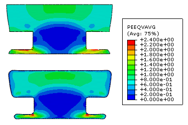 A contour plot of the equivalent plastic strains in a cross-section of the