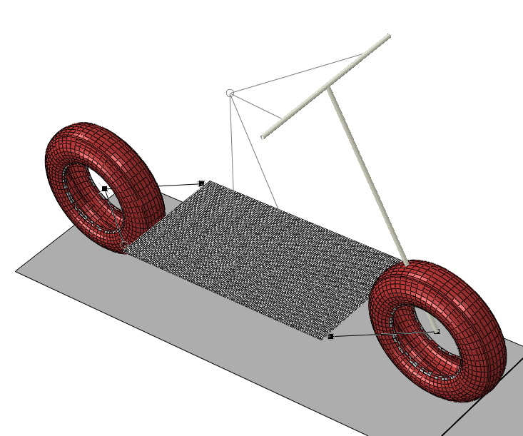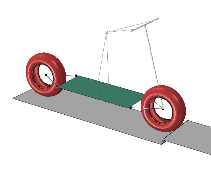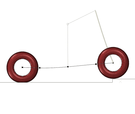 This example considers the impact of a recreational scooter with a bump. An analysis of the transient response of an interaction with a bump is used to determine the accelerations felt by the scooter operator. With this analysis a product designer can make informed design decisions by varying certain design parameters, such as the frame component cross-section properties, tire material, or inflation pressure and observing their influence on the operator acceleration. Effective use of this simulation technique requires that the simulation turnaround time be as quick as possible while retaining essential fidelity in the results.