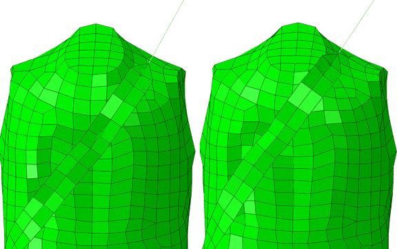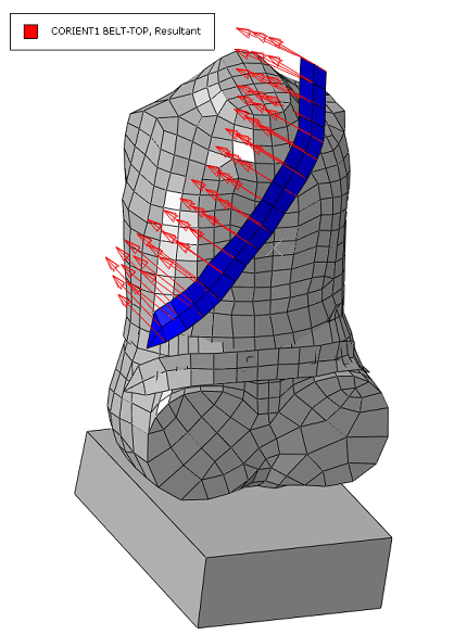 A PIN-type MPC is used to connect the node associated with the waist-level click-in ring that slides over the seat belt (node 8300251) with the buckle it clicks into (node 8300351). By using the additional node 8300351, the material flows associated with the pretensioner SLIPRING and the SLIPRINGs of the adjacent seat belt segments are prevented from interacting with each other.