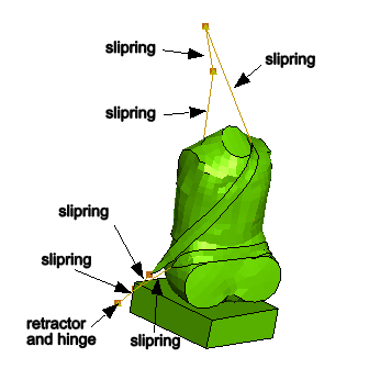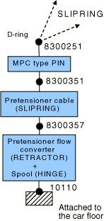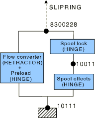 The pretensioner device is attached to the car frame in the vicinity of the waist-level click-in buckle. It is modeled using a SLIPRING connector and a RETRACTOR and a HINGE connector in parallel as illustrated in Figure 4. The connections are as follows: