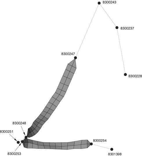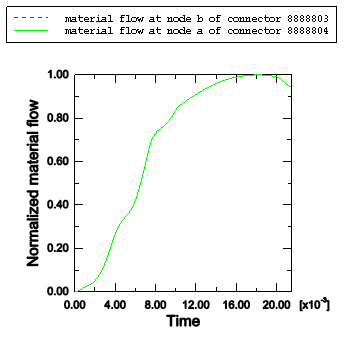 Since no material flow occurs at the connection points with the membrane-meshed regions, boundary conditions on degree of freedom 10 are specified at nodes 8300248 and 8300253.