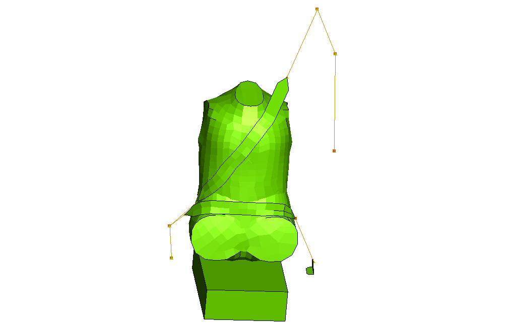 A very simple dummy model is used (none of the limbs are modeled). The dummy model has two distinct parts, the lower torso and the upper torso, that are connected together through a rigid connector. The lower torso is modeled with rigid surface elements. The upper torso is modeled in the same fashion except in the chest area. The human body compliance is modeled approximately by meshing a region in the chest area using deformable shell elements. In addition, four CARTESIAN and CARDAN connectors with nonlinear elastic and damping behavior are inserted between four nodes around the chest area and four nodes belonging to the rigid back of the upper torso. The upper and lower torsos overlap over a small region around the waist area, but contact is excluded to avoid the interaction between them. The approximate mass of the dummy is 35 kilograms.