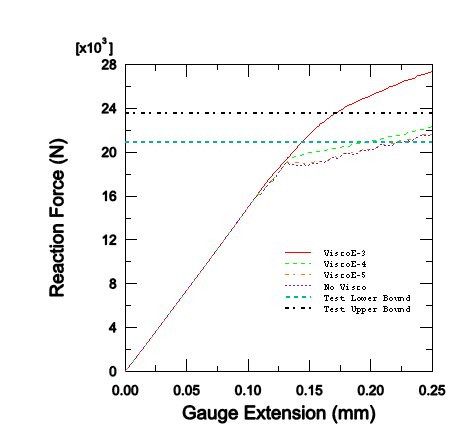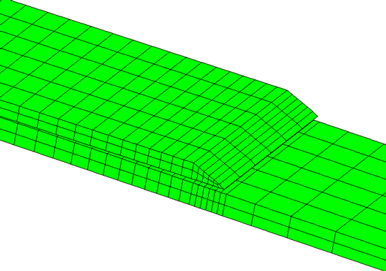 The finite element mesh for the three-dimensional model of the debonding problem is identical to that used in Davila (2003) except that the “decohesion” elements utilized in that reference to represent the skin/flange interface are replaced with Abaqus cohesive elements. Both the skin and the flange are modeled by two layers each of C3D8I elements. The interface between them is represented by COH3D8 elements, with the cohesive element mesh sharing nodes with the matching C3D8I meshes of the flange and the skin on either side. The model has a total of 828 solid elements and 174 cohesive elements. As stated in Davila, the two tapered ends of the flange are discretized differently to eliminate model symmetry and to prevent simultaneous delamination from occurring at both ends. The analysis includes a thermal loading step prior to the mechanical loading to simulate the residual stresses in the specimen due to a difference of 157°C between the curing temperature and room temperature. The temperature difference causes residual stresses at the skin/flange interface due to the fact that the thermal expansion coefficients of both the skin and flange material are orthotropic (even though they are specified to be the same) and the ply layups in the skin and flange are different.