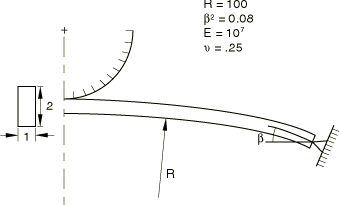 The shallow arch depressed with a rigid punch is shown in Figure 3. The analysis uses the same model of the arch as the first problem. However, the end is pinned rather than clamped, and load is applied through the displacement of the punch. The pinned boundary condition makes the problem more unstable than the clamped-end case. A preliminary analysis in which the arch is depressed with a prescribed displacement of the midpoint of the arch shows that the force will become negative during snap-through. Thus, if the arch is depressed with a rigid punch, the Riks method will not help convergence because, at the moment of snap-through, the arch separates from the punch, and the movement of the punch no longer controls the displacement of the arch. Therefore, contact damping is introduced to aid in convergence. Viscous damping with surface contact adds a pressure that is proportional to the relative velocity to slow down the separation of the arch from the punch.