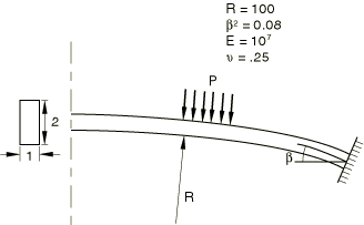 The shallow circular arch is shown in Figure 1. Since the deformation is symmetric, one-half of the arch is modeled. Ten elements of type B21 (linear interpolation beams) are used. A uniform pressure is first applied to snap the arch through. The loading is then reversed so that the behavior is also found as the pressure is removed.