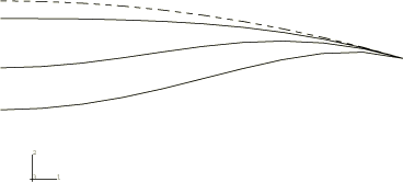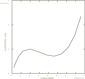For the clamped shallow arch the initial snap occurs at a pressure of about −1000 (force/length2 units). Thus, −250 (force/length2 units) seems to be a reasonable estimate for the first increment of load to be applied. Accordingly, an initial time increment of 0.05 is specified for a time period of 1.0 and a pressure load of −5000 (force/length2 units). The solution will have been sufficiently developed at a pressure of about −2000 (force/length2 units). Therefore, the analysis is terminated when the load proportionality factor exceeds 0.4.