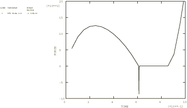 The viscous damping clearance is set to 10.0, and the fraction of the clearance interval is set to 0.9; the damping is constant for a clearance of up to 9.0. Since the arch is 4.0 units high, the distance traveled by the top of the arch from the initial position to the final snap-through position is 8.0 units. This distance is clearly larger than the clearance between the middle of the arch and the tip of the punch at any time during the analysis. Thus, the viscous damping is in effect for the whole period when the arch has separated from the punch.