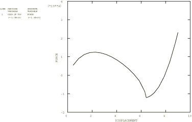To illustrate the use of Riks in several steps, a second step is included in which the pressure is taken off the arch so that it will snap back toward its initial configuration. At any point in a Riks analysis, the actual load is given by , where is the load at the end of the previous step, is the load magnitude prescribed in the current step, and is the load proportionality factor. The arch is unloaded so that in the initial time increment, a pressure of approximately 0.15 is removed. Using an initial time increment of 0.05 in a time period of 1.0, a load of is prescribed for this restarted step. Furthermore, we want the analysis to end when all the load is removed and the arch has returned to its initial configuration. Therefore, a displacement threshold of 0.0 is set for the center of the arch. The analysis terminates when this limit is crossed. Because Abaqus must pick up the load magnitude at the end of the initial Riks step to start the next step, any step following a Riks step can be done only as a restart job from the previous step.