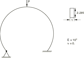 The deep circular arch is shown in Figure 2. One end of the arch is clamped, and the other is hinged. A concentrated load is applied at the apex of the arch. The arch undergoes extremely large deflections but small strains. Because of the asymmetric boundary conditions, the arch will sway toward the hinged end and then collapse. The arch is almost inextensible for most of the response history. Sixty elements of type B31H are used. Hybrid elements are used because they are most suitable for problems such as this.
